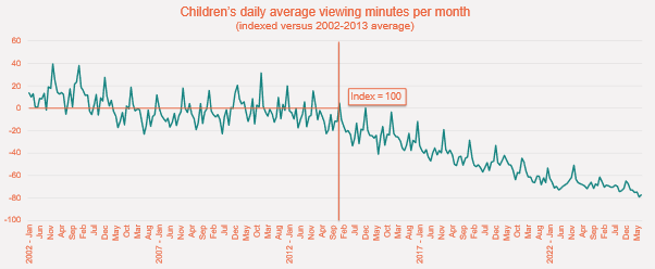 If we look at the chart above, we can see that by 2015/16, kids’ viewing time was down by around 40% on the 2002-2013 average.