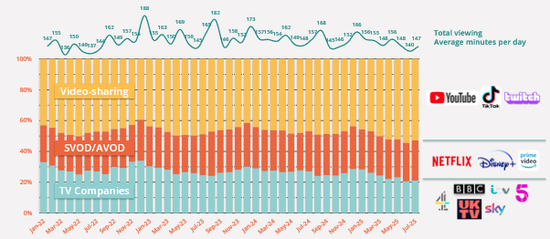 From 2002 to 2013, kids’ time with TV companies’ content was broadly stable at around 140 minutes per day in any given month. The average for all people 4+ over the same time period was 227 minutes per day. Kids have always watched less than average; they tend to sleep more than adults. If we average the monthly time with TV companies’ content over these twelve years and continue to compare each month up to July 2025, not one single month contains more viewing to TV companies’ content than the 2002-13 monthly average.