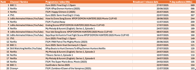 Taking one week of the most-watched kids’ content, the influence of Netflix is clear to see. BBC and ITV feature five times, but four of those relate to the Lionesses’ successful defence of their European Championship crown. The film KPop Demon Hunters from Netflix was released a full month before the week of analysis, but is otherwise the top show.